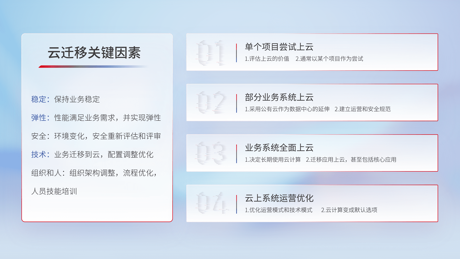 结合实际业务,,从规划设计、、、云平台选型、、云原生改造、、、数据迁移、、、集成交付,,,迁移全过程为客户识别最佳上云路径,,,,做好风险识别管理,,设计网络架构、、、身份权限、、、安全审计合规、、、操作审计、、日志审计、、监控告警策略、、、、多站点容灾设计等,,,对云上基础设施进行整体规划,,提升IT治理水平,,以满足弹性、、、、高可用、、、、高性能的需求。。