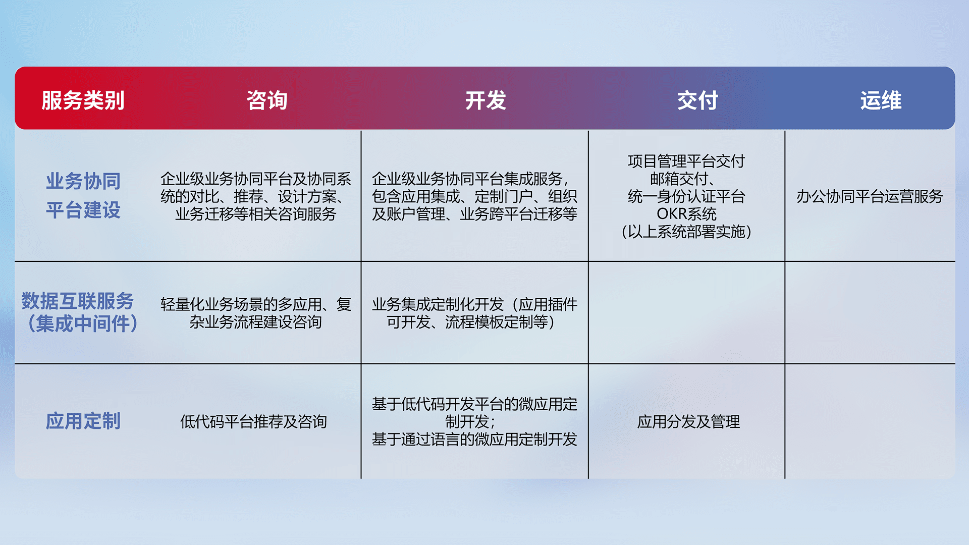 针对钉钉、、、、企微、、、、IDaas等平台级产品提供产品的规划、、、、方案、、、交付、、、、定制化开发等服务,,实现如统一协同办公、、、、智能客户服务、、、混合会议管理、、、智能数据查询、、、、等业务场景,,,,实现数字化转型。。